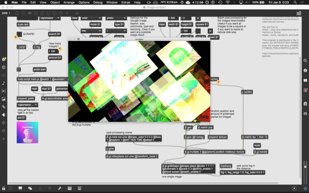 This project demonstrates how [node.script] can be used to to combine various node packages (image-scraper, jimp, image-size) to download many images based on your image-search and apply them to a Jitter visual project.