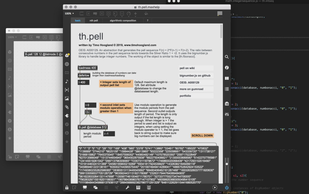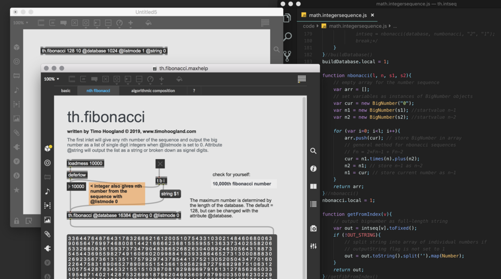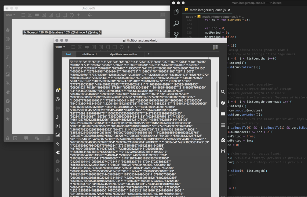 The package uses the bignumber.js library to handle large integer numbers in javascript. The output is a list of strings to make sure the integers remain intact. When setting the second inlet to perform modulo operation on the sequence the output will switch to list of integers and will give you the so called Pisano periods. Second outlet gives an integer for the length of the pisano period, this length is -1 when the total list length is not long enough to find the length of the period.