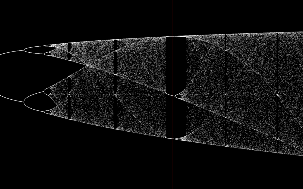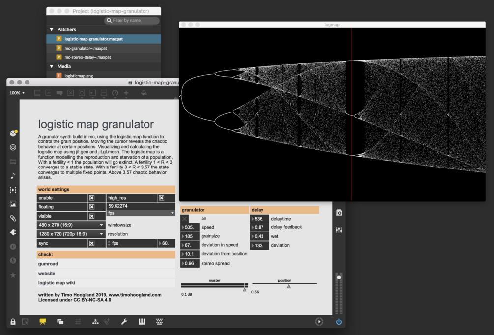 A granular synth build in mc with mc.gen~, using the logistic map function to control the grain position. Moving the cursor reveals the chaotic behavior at certain positions. Visualizing and calculating the logistic map using jit.gen and jit.gl.mesh. The logistic map is a function modelling the reproduction and starvation of a population. With a fertility < 1 the population will go extinct. A fertility 1 < R < 3 converges to a stable state. With a fertility 3 < R < 3.57 the state converges to multiple fixed points. Above 3.57 chaotic behavior arises.